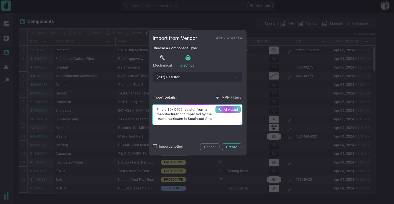 Say there was a weather event an engineering team wanted to get ahead of. An AI-partnered PLM could allow the team to easily scan their product BOMs for components produced in the weather-affected region, and then look for manufacturers in unaffected regions.