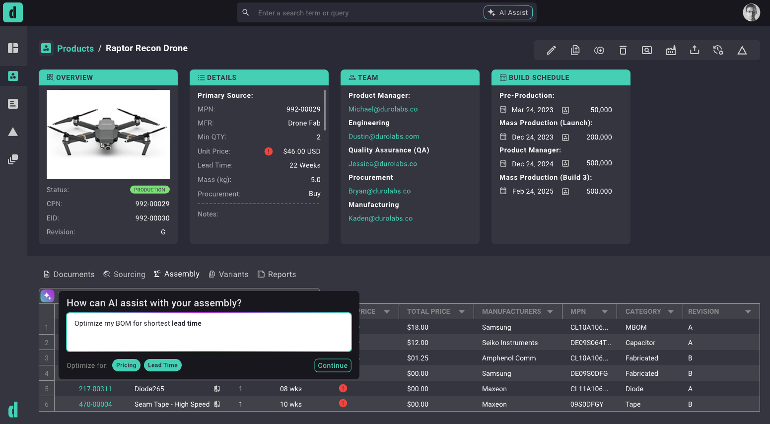 Duro’s AI-enabled cloud-native PLM is designed for today’s product development needs. It combines engineering processes and AI with rich supply chain data to help make better products faster. Our intuitive PLM platform empowers teams to continually optimize their product development and manufacturing processes.
