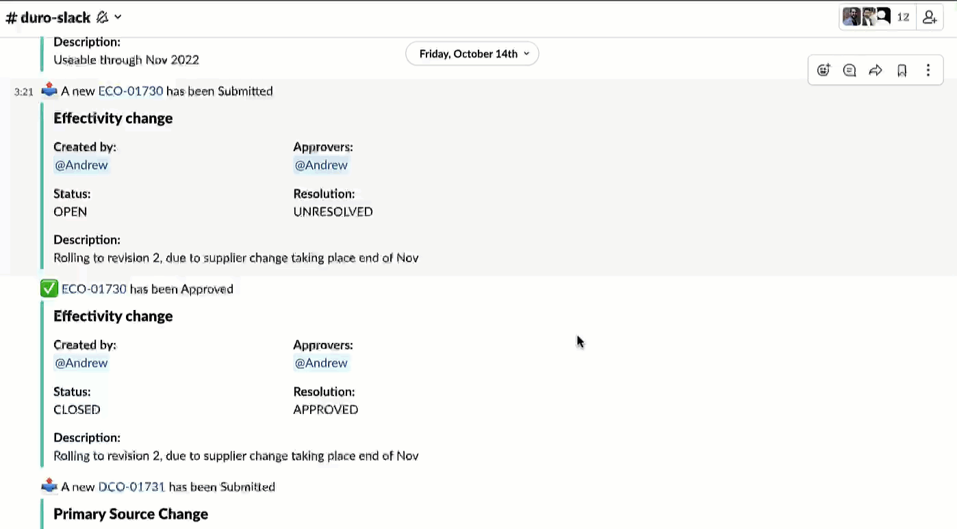 Here’s how it works: whenever a Change Order is submitted, approved, rejected, or closed, preselected approvers and notifiers will immediately receive alerts to a designated channel in Slack. That notification includes a handy hyperlink that takes you straight to the Change Order in Duro. This means you can quickly dive into all the important details whenever modifications are made to a product or component, preventing you from having to manage Change Order updates on your own. Centralizing PLM notifications to Slack eliminates the need to switch back and forth between applications to keep everyone in the loop.