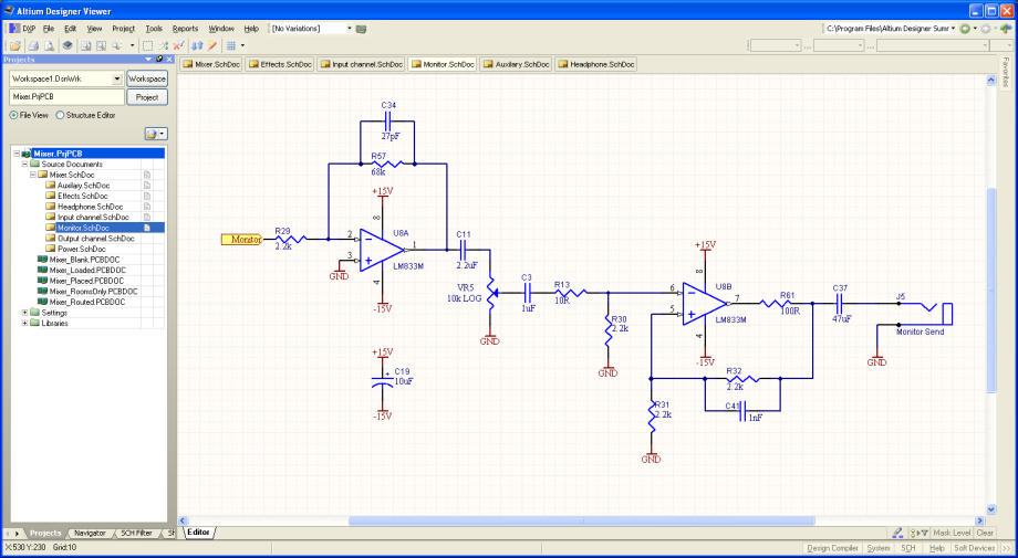 A PCB schematic is an internal pictorial representation of the final product that will be assembled. Rather than being a direct diagram of parts, the schematic is more of a functional representation of what the circuit board will look like. Here is an example of a PCB schematic in Altium CAD.