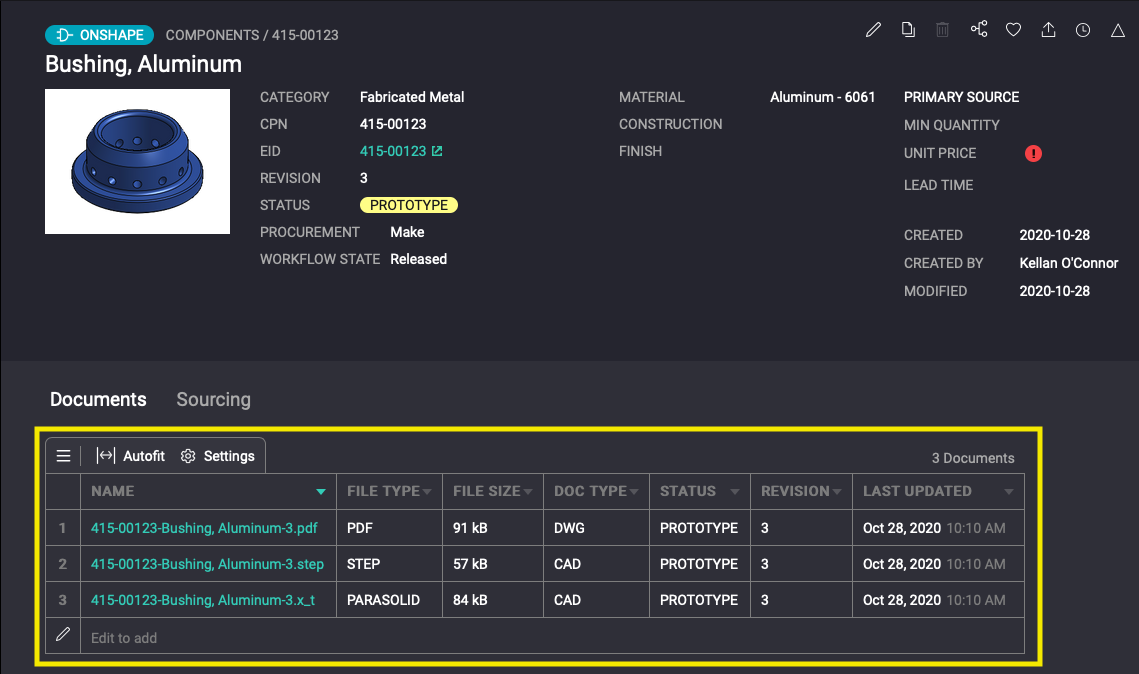 A fully approved Change Order will initiate a final release process, publishing all release drawings and production files from Onshape to Duro. See Figure 6 below with the Documents tab highlighted, showing three separate released documents: a PDF drawing and two production format CAD files (.STEP and Parasolid).