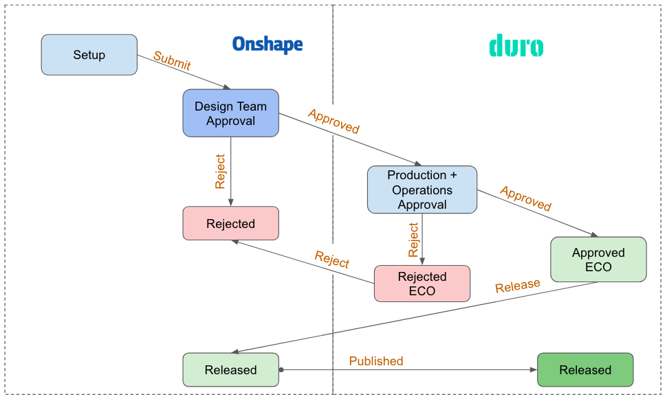 Figure 2: Onshape-Duro Two-Phase Change Order and Release Workflow