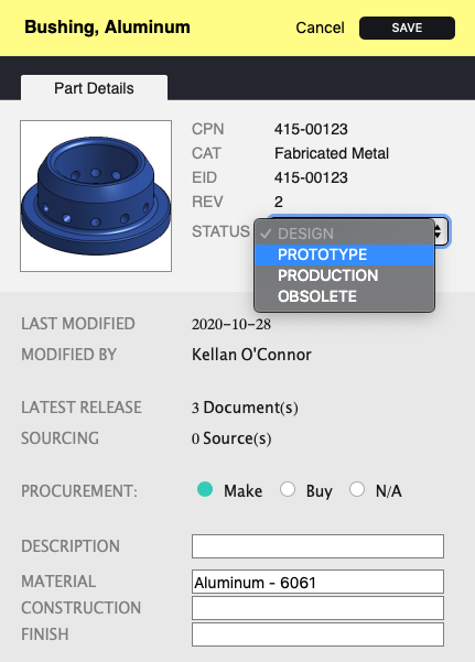 The second step is to set each component to the correct status value in Duro, to assure the component is revision controlled within Duro. This can be done quickly in edit mode of the Part View for any component loaded in the Duro PLM app. To properly enable the two phase release and approval workflow you’ll want to select either Prototype or Production status.