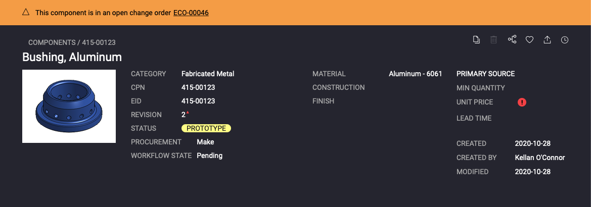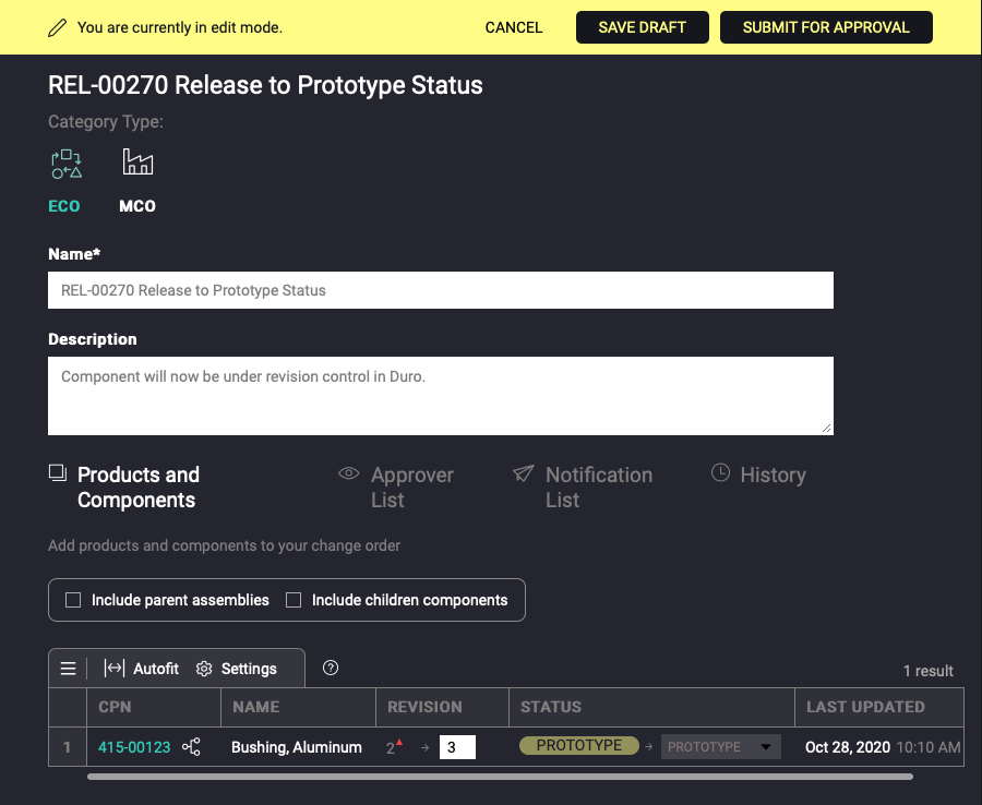 Second, Duro will automatically generate a Change Order for the corresponding components in Duro. In Duro, at the top of each component page (for the components included in the release candidate), a banner will be visible, indicating that the component has been added to a Change Order.