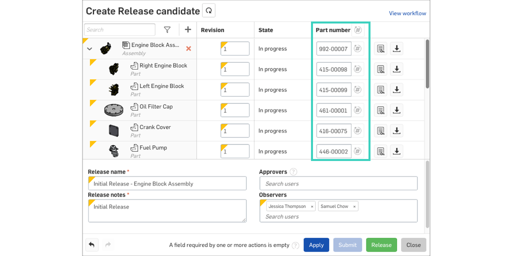 Of course, the value of the Duro PLM app for Onshape only grows with each release generated from Onshape to Duro. Duro has built its release feature to be completely compatible with the existing Onshape Release Management workflow. Nothing changes for the Onshape user, they load the same Release modal and go through the same steps. Shown below, you’ll see that Duro-based part numbers are now present in the Release Candidate modal, as they are throughout the app for corresponding components.