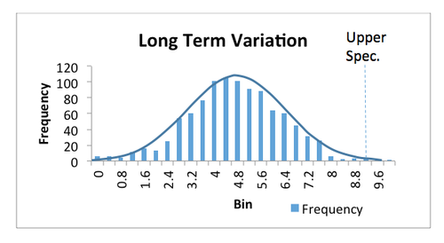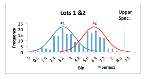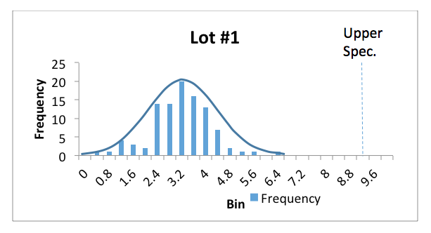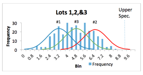 Notice that the data still are normally distributed. The process shifts for each lot, when considered over multiple lots, result in more variation over the production run. This is also a good indication of a process that is “three sigma capable”, meaning that the difference between the upper specification limit and the mean of the data is approximately three standard deviations.